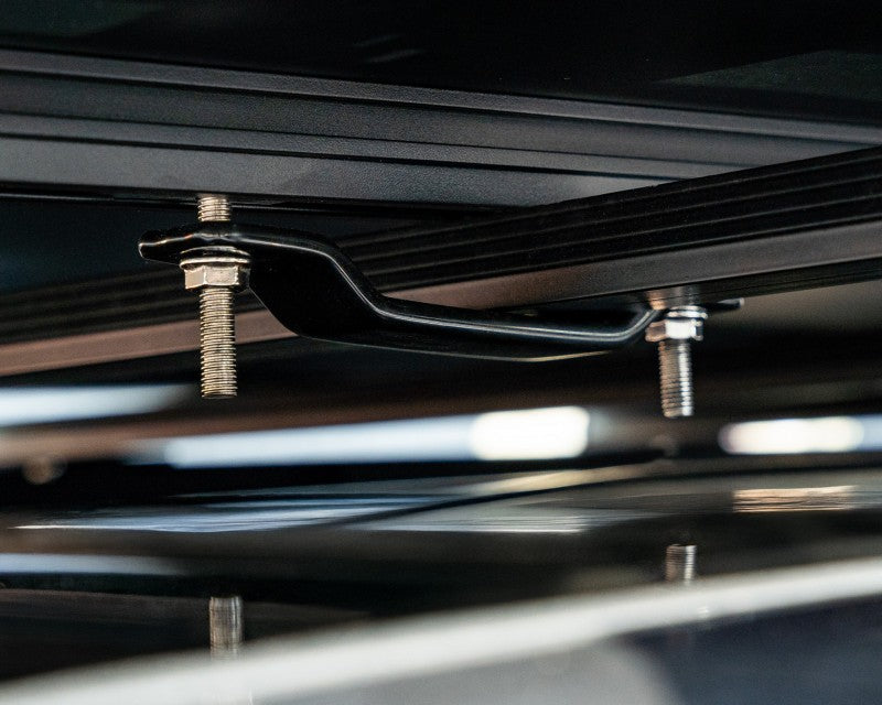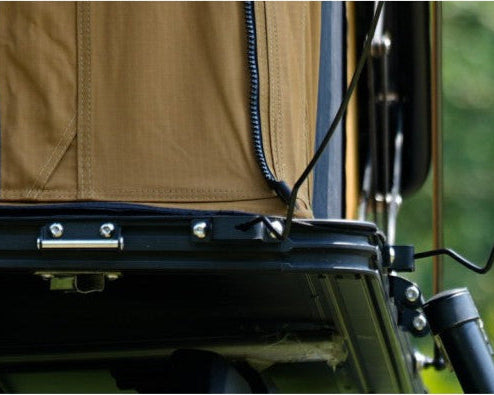 All of our roof tents are equipped with a flexible fastening system that can be adjusted to the distance between your luggage rack rails and gives you the choice of opening the tent either to the side or to the back. The actual connection between the tent and the roof rack is made by sliding fastening plates with stainless steel screws. These are standardized M8 screws that are suitable for luggage rack rails up to a height of 5cm. If your rack exceeds this thickness, suitable longer screws are available in any hardware store. The fastening plates are suitable for luggage rack widths of up to 6.5cm (wider plates are also available). Please check the static and dynamic maximum load in your roof rack description before installing the tent.